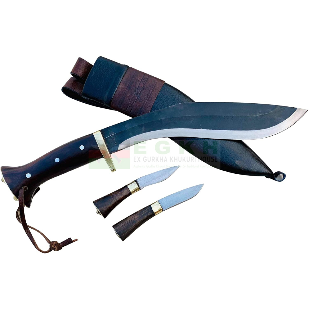 11″ long black Blade handmade Kukri knife by Bishwakarma at Ex-Army Kukri House factory in Nepal.