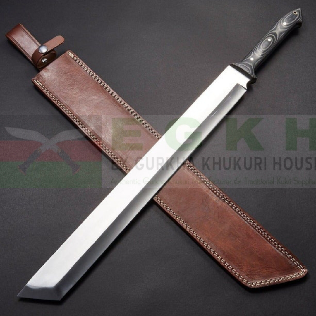 The handle of the 18″ Hand forged D2 Steel Wakizashi Sword | Handmade Combat Sword | EGKH is made of rosewood, which is both elegant and durable. The handle has a length of 7 inch, providing a secure and comfortable grip for the user. The sheath of the sword is made of water buffalo leather, which is both durable and stylish, and it helps protect the blade when it is not in use. This sword is also an ideal outdoor or jungle knife, designed for heavy-duty use such as bone chopping, camping, and other outdoor activities.