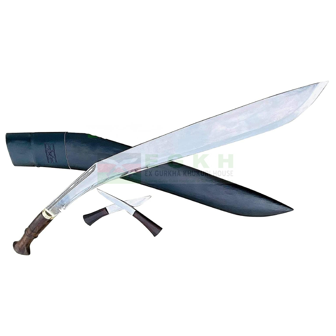 36″ Buff Head Khukuri | Hand Forged Sacrificial Large Kukri | EGKH has earned the distinction of being the largest and heaviest blade of its kind, not only within Nepal but potentially globally. Originating from the renowned khukuri-producing region of Bhojpur in eastern Nepal, this variant is aptly named the Bhojpure khukuri. Boasting an impressive 36-inch blade and a total length of 47 inches, including its 11-inch wooden handle, it surpasses the standard khukuri in both size and weight.